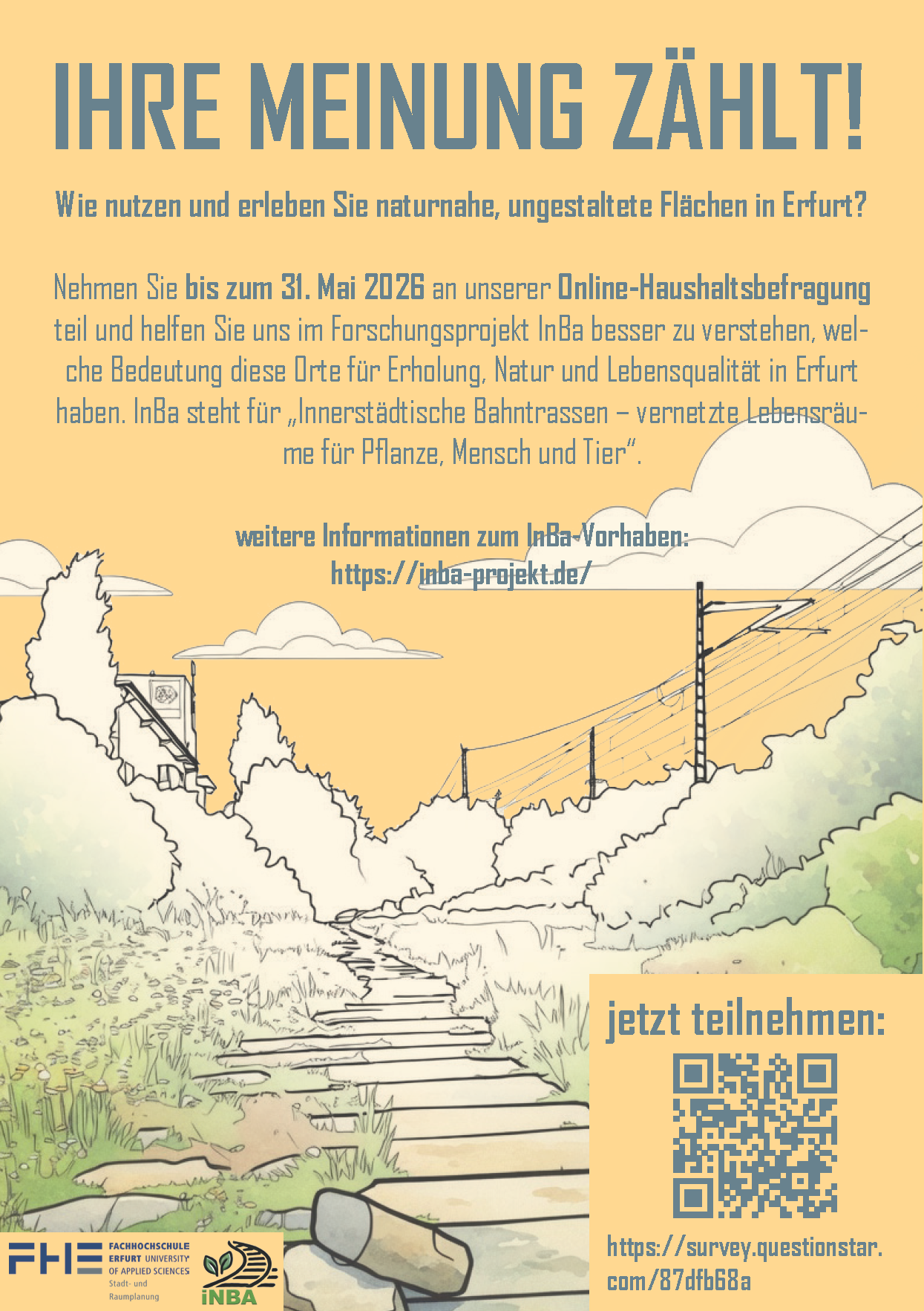 Im Rahmen des InBa-Vorhabens führen wir aktuell bis zum 31.05.2026 eine Haushaltsbefragung durch. Mit der Haushaltsbefragung möchten wir insbesondere die Naturwahrnehmung und Freiraumnutzung naturnaher, ungestalteter Flächen in Erfurt besser verstehen. Die Ergebnisse können dazu beitragen, das Potenzial und die Grenzen solcher Flächen für die städtische Naherholung und die Versorgung mit Erholungsräumen zu bewerten.